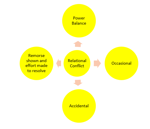 Relational conflict usually involves individuals and groups who are relatively similar in power and status. It is generally behaviour which happens occasionally, and the offence might be accidental.