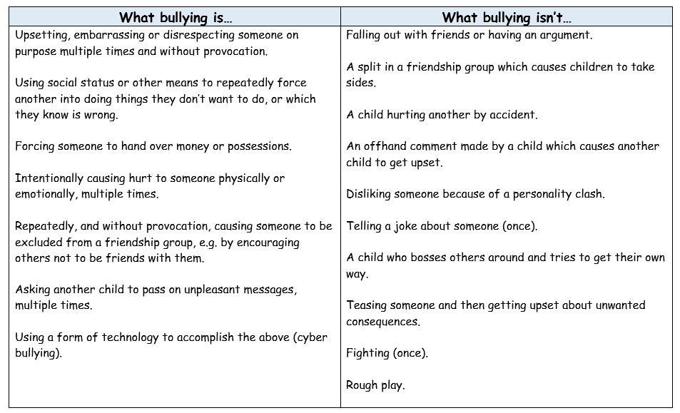 Bullying is "behaviour by an individual or group, repeated over time, that intentionally hurts another individual or group either physically or emotionally". A culture of anti-bullying is vital in schools, as bullying can have extremely negative effects on a child's health and wellbeing.