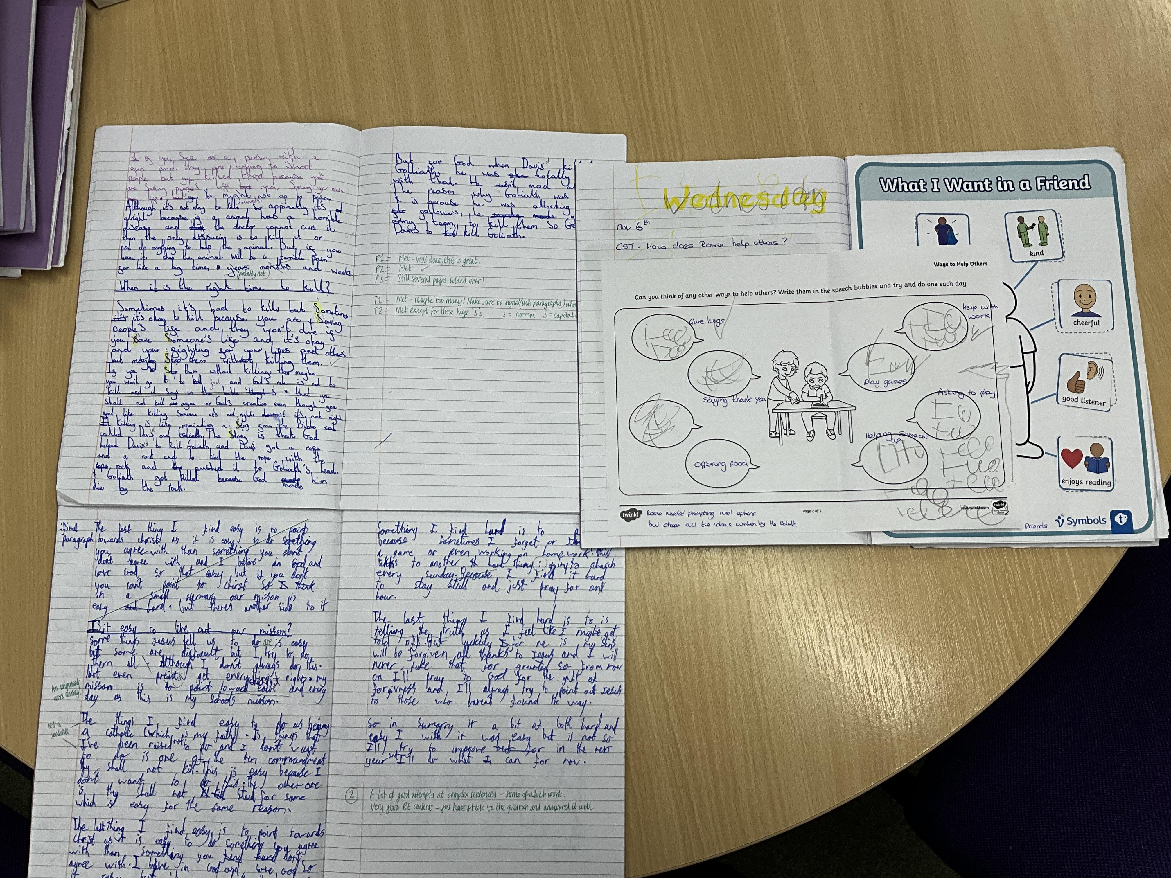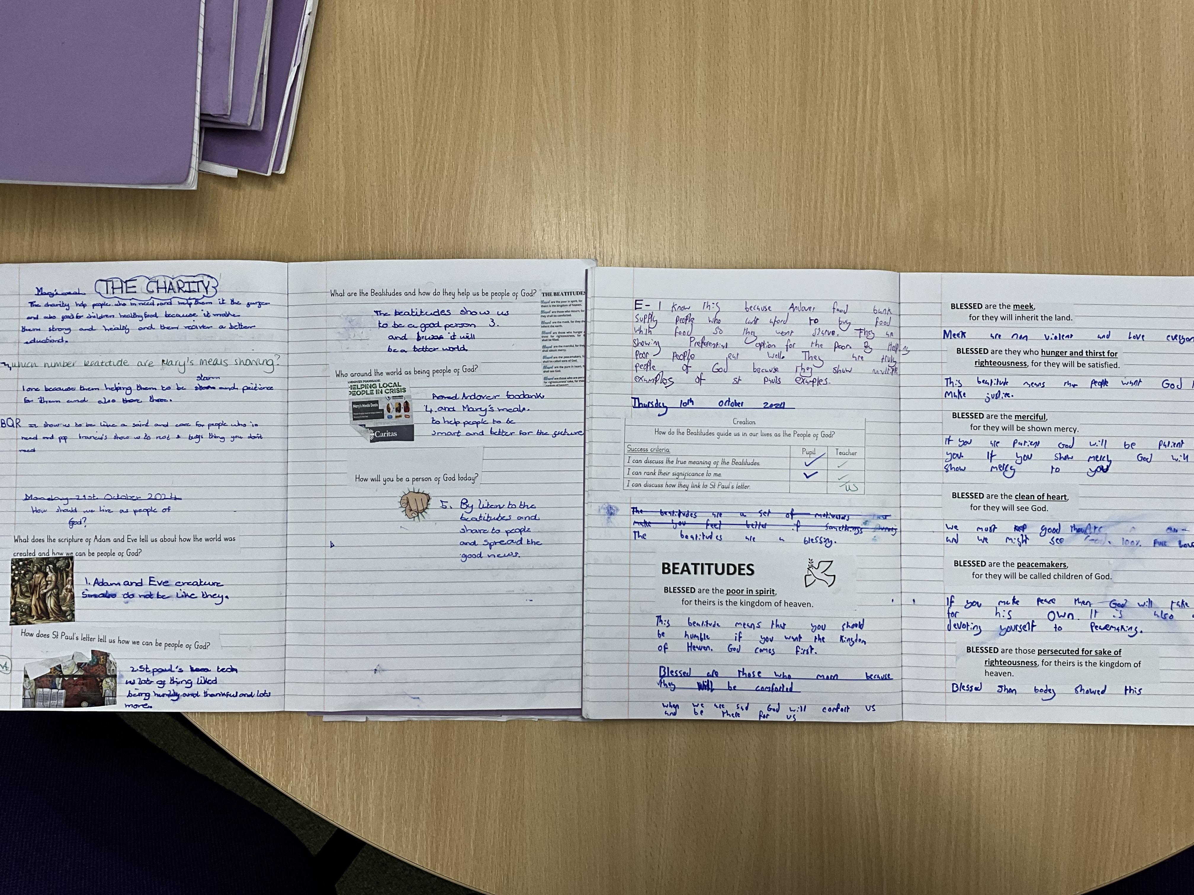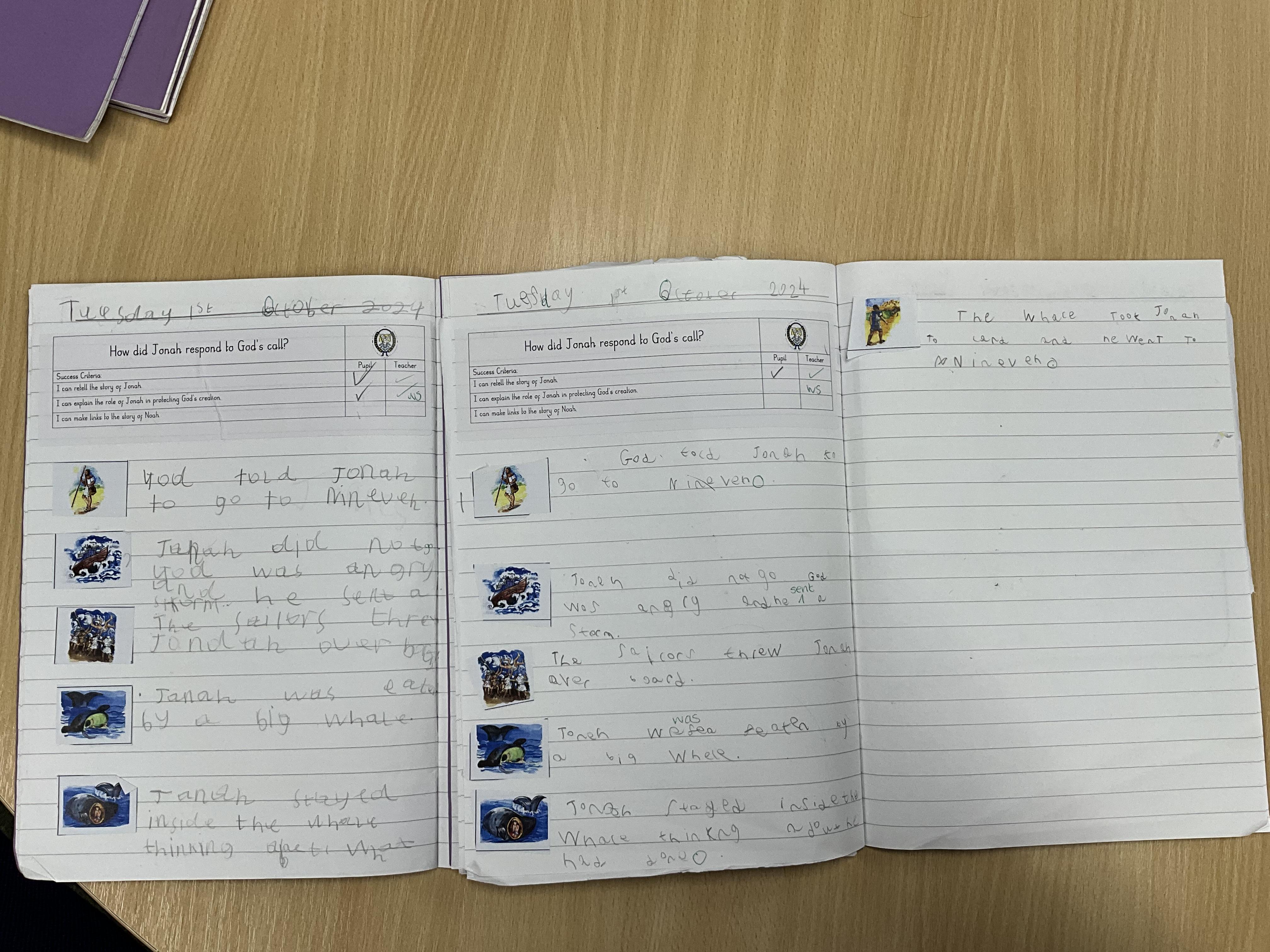 All classes contribute to a Class Spiritual Journey Book in which their individual prayers and reflections are recorded. The younger pupils work alongside teachers to prepare their prayers, and children are developing the capacity to evaluate the quality of class liturgical prayer, enabling them to identify how to improve for next time.