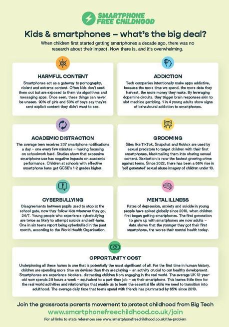When smartphones were first introduced to children, we were unaware of their potential impact. Now, a growing body of evidence links smartphone use to various harms, including anxiety, depression, and loneliness. Smartphones can expose children to pornography, cyberbullying, grooming, and violent or extreme content. Research indicates that smartphones can negatively affect academic performance, and many children exhibit signs of behavioural addiction to their devices.