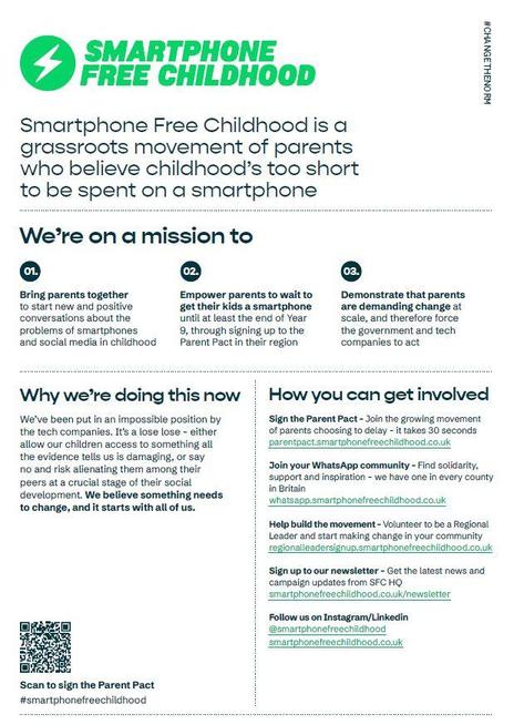 2. Sign the Pact. By signing this Pact, you join a fast-growing community of families across the UK who are choosing to wait to give their child a smartphone, until at least the end of Year 9. It takes 30 seconds to sign the Parent Pact, and the more who do, the quicker we'll change the social norm. https://parentpact.smartphonefreechildhood.co.uk/